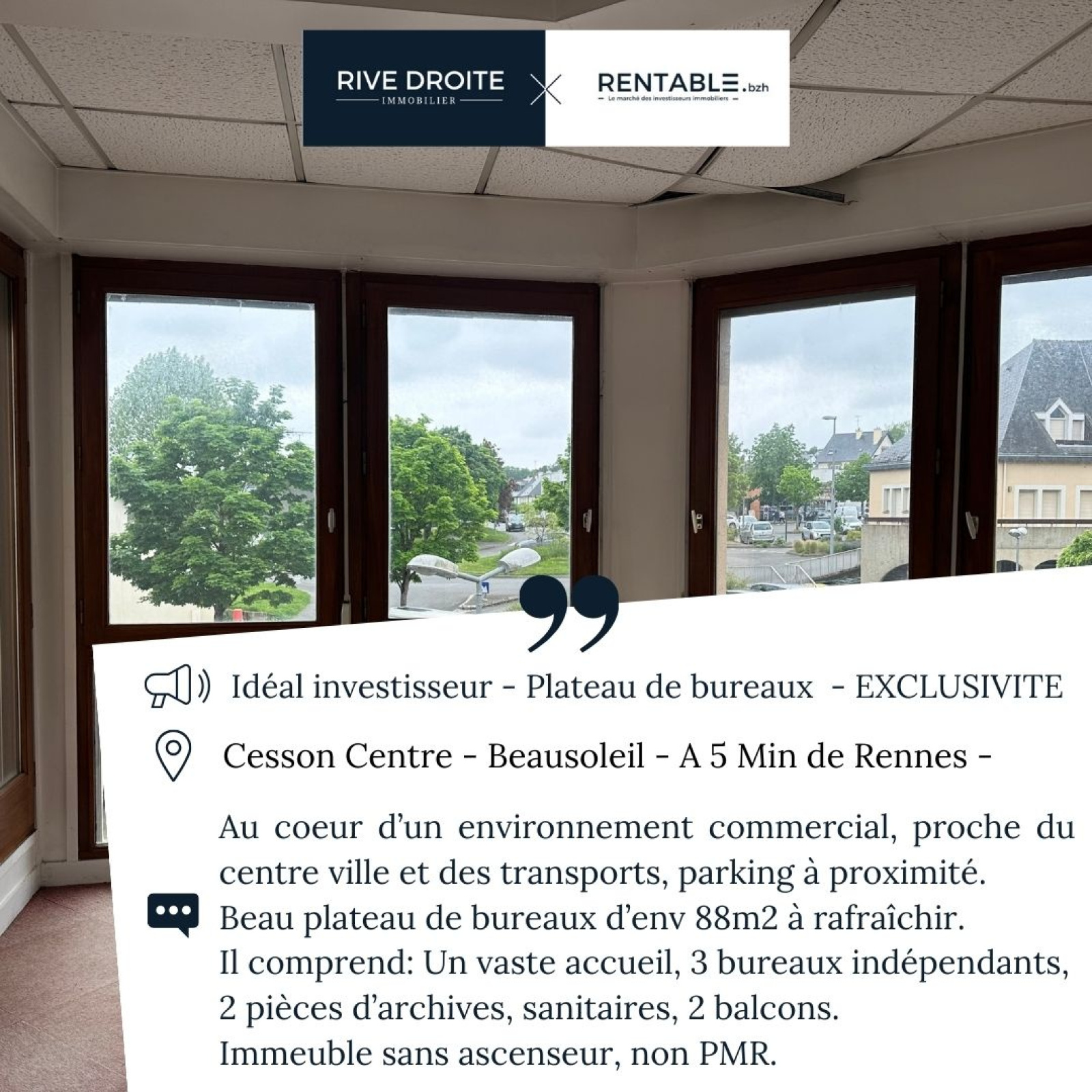 EXCLUSIVITE RIVE DROITE - VENDU PAR L'AGENCE - CESSON SEVIGNE - CENTRE - BEAUSOLEIL- Au coeur d'un pole commercial dynamique, à proximité immédiate du centre ville et des transports (bus) - Local professionnel d'env 88m2 à usage de bureaux situés au 1er étage sans ascenseur de la résidence. Ces bureaux non PMR, actuellement libres d'occupation comprennent un vaste espace accueil (19m2), 3 bureaux indépendants (11m2, 21m2, 21m2), un espace archive, un espace reprographie, sanitaires, 2 balcons. Chauffage Electrique - Changement de destination envisageable- Travaux à prévoir - Idéal investisseur ou occupant (profession libérale, tertiaire, conseil...) - Beau potentiel de rentabilité et de valorisation - Rare à la vente - A SAISIR
